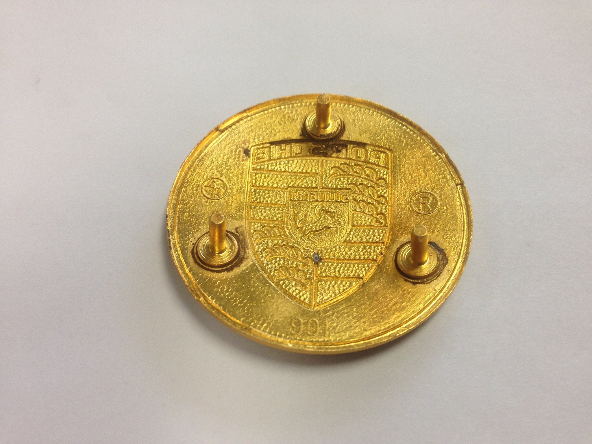 New old stock genuine Porsche gold enameled hub cap crest with later style red bars.